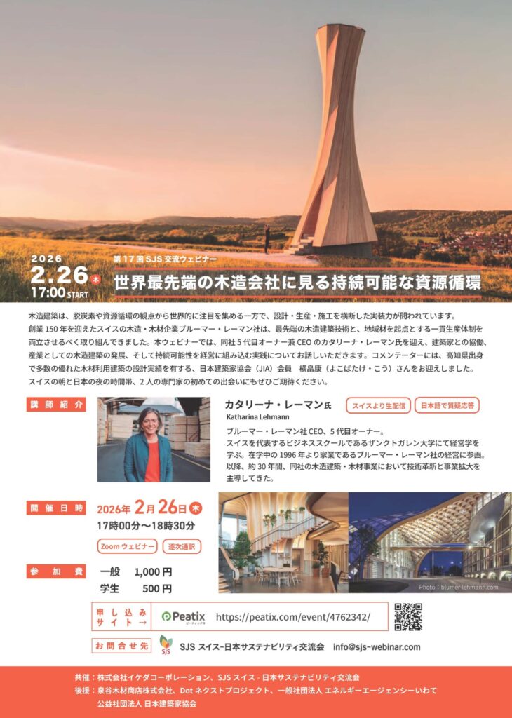 創業150 年を迎えたスイスの木造・木材企業ブルーマー・レーマン社は、最先端の木造建築技術と、地域材を起点とする一貫生産体制を両立させるべく取り組んできました。本ウェビナーでは、同社5 代目オーナー兼CEO のカタリーナ・レーマン氏を迎え、建築家との協働、産業としての木造建築の発展、そして持続可能性を経営に組み込む実践についてお話しいただきます。コメンテーターには、高知県出身で多数の優れた木材利用建築の設計実績を有する、日本建築家協会(JIA)会員 横畠康(よこばたけ・こう)さんをお迎えしました。
