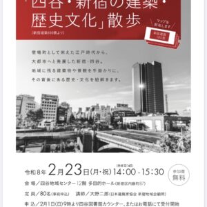2026.01.28 更新 JIAその他 【新宿地域会】「四谷・新宿の建築・歴史文化」散歩 講師:大野二郎 開催日時2026年2月23日(月・祝)14:00~15:30 開催場所四谷地域センター12階多目的ホール(東京都新宿区内藤町87)