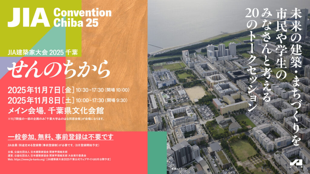 公益社団法人 日本建築家協会(JIA)は、2025年11月7日(金)、8日(土)の2日間、千葉県文化会館と千葉大学ゐのはな同窓会館を会場に「JIA建築家大会2025千葉」を開催します。今年の大会テーマは、「せんのちから」です。