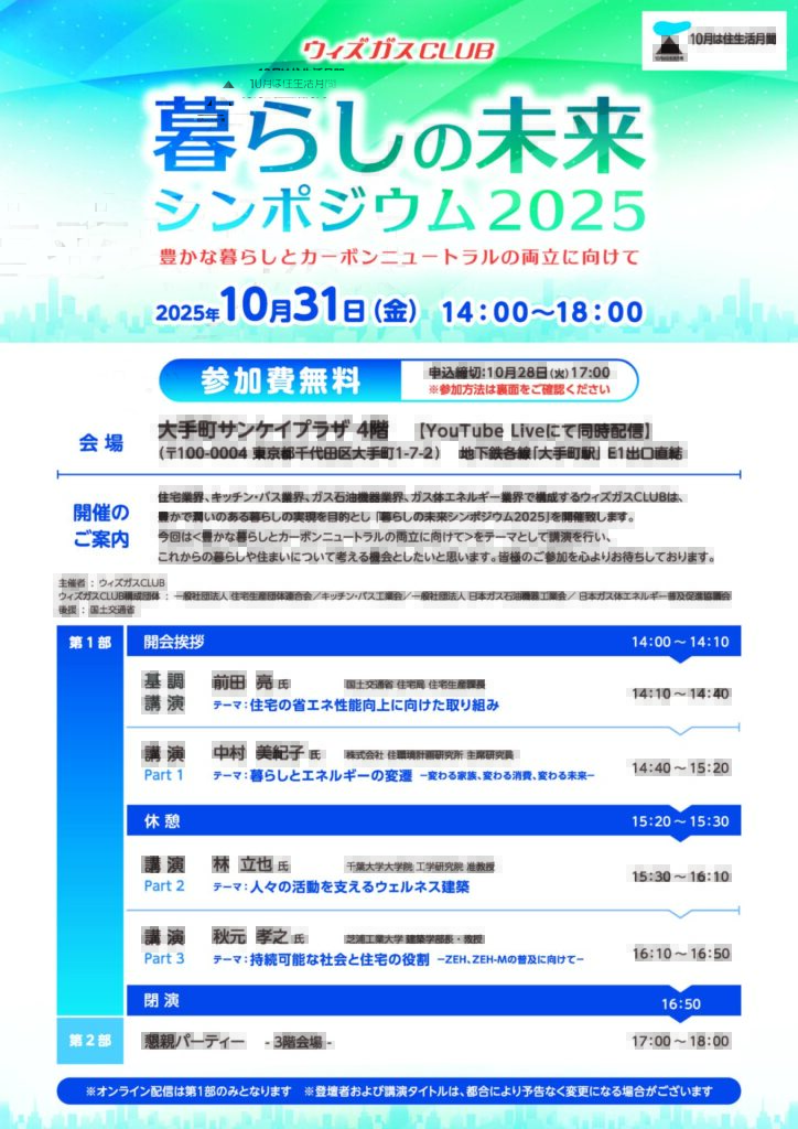 2025.10.06 国内 【ウィズガスCLUB】暮らしの未来シンポジウム2025 「豊かな暮らしとかーボンニュートラルの両立に向けて」 10月31日(金)14:00 〜18:00 大手町サンケイプラザ4階 (オンラインで視聴併用)