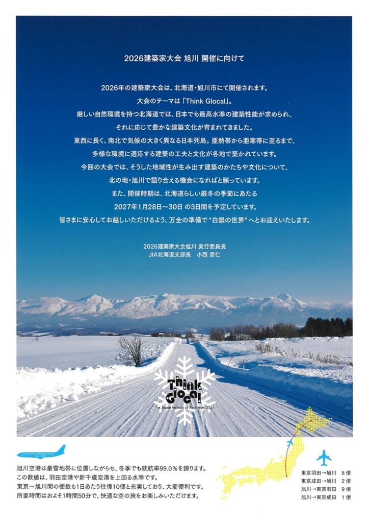 先日開催されたJIA建築家大会2025千葉において、次年度の大会が2027年1月28日~30日の期間で北海道、旭川市にて開催されることが発表されました。